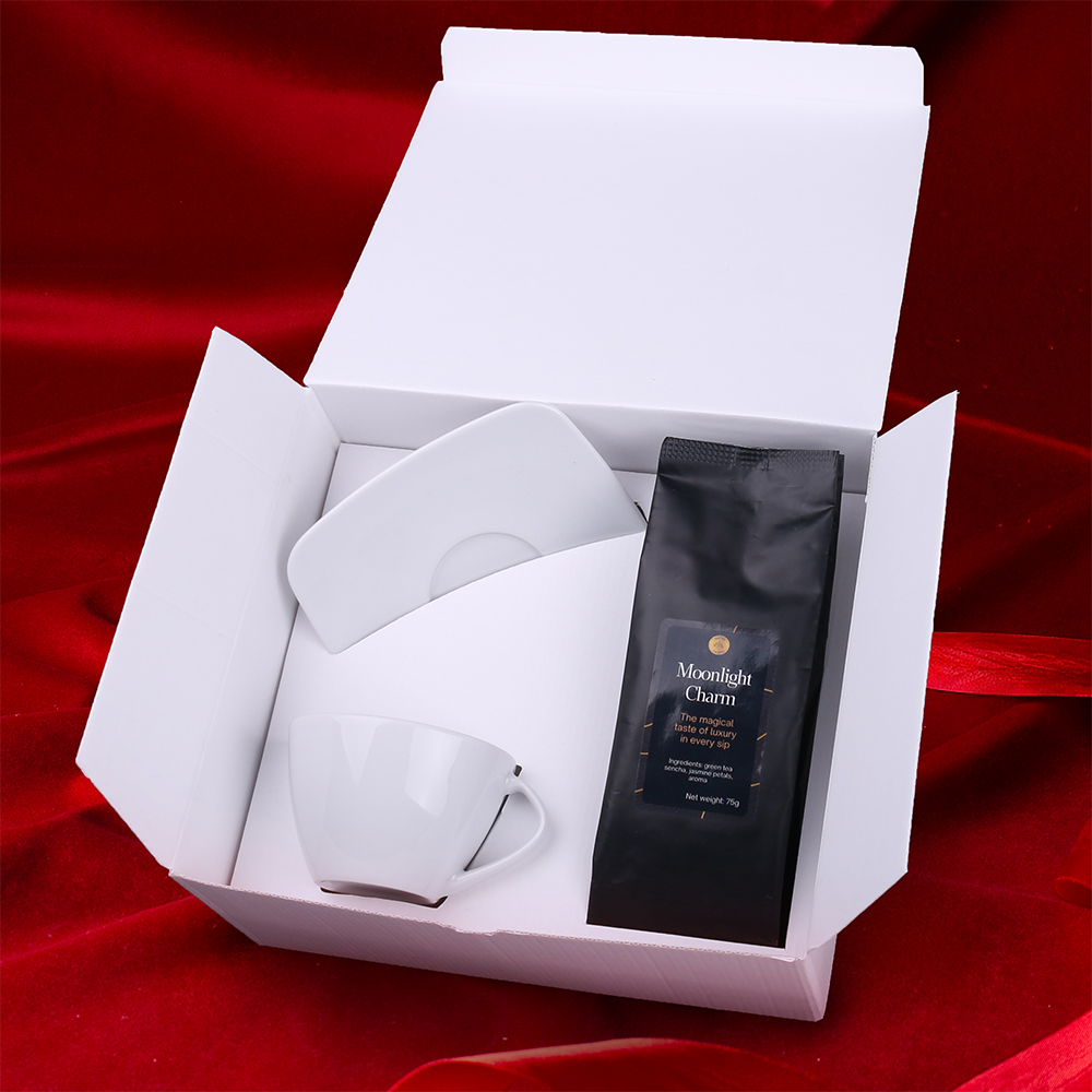 Die elegante Porzellantasse Luna Set zusammen mit dem aromatischen grünen Tee "Moonlight Charm" mit Jasmin – eine Komposition, die an besondere Momente erinnert. Das Set ist in einer speziellen umweltfreundlichen Enlight-Verpackung verpackt und mit einer eleganten personalisierten Banderole versehen. DIE DARGESTELLTE VERZIERUNG DIENT NUR ZUR VERANSCHAULICHUNG UND IST NICHT IM PRODUKTPREIS ENTHALTEN. DAS SET IST IN EINER SPEZIELLEN ENLIGHT-VERPACKUNG MIT EINER AUSGEWÄHLTEN VERZIERUNGSOPTION ERHÄLTLICH.