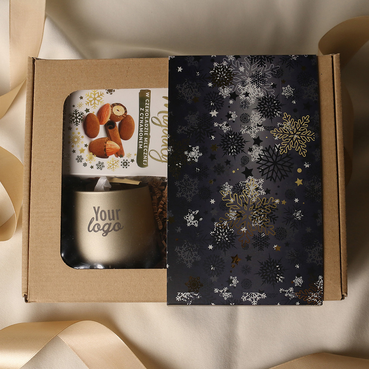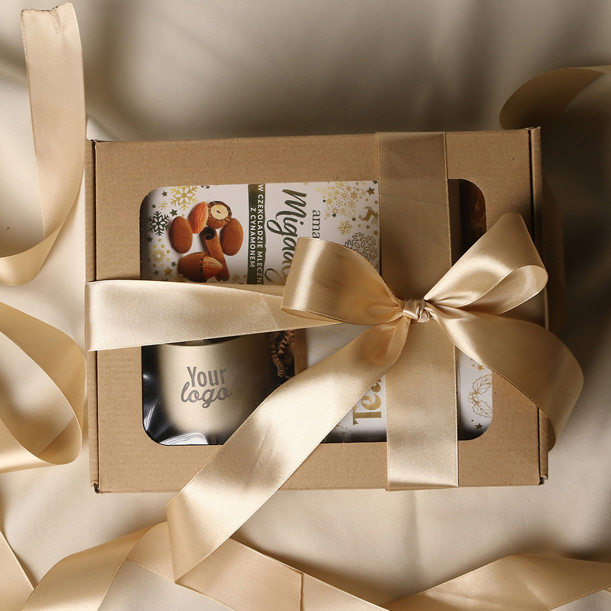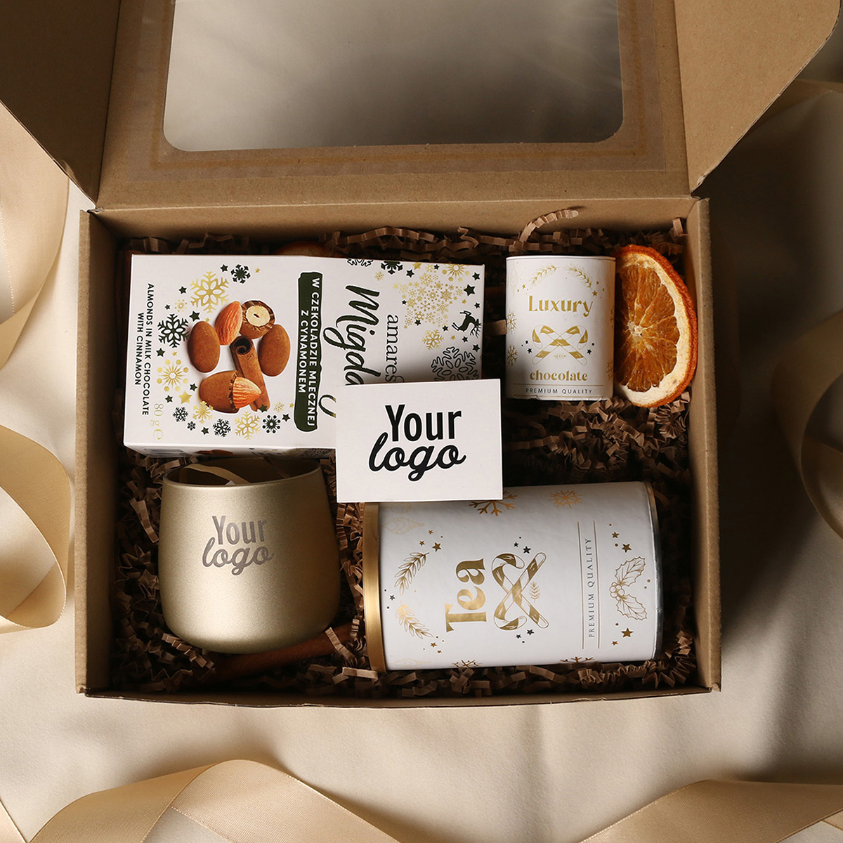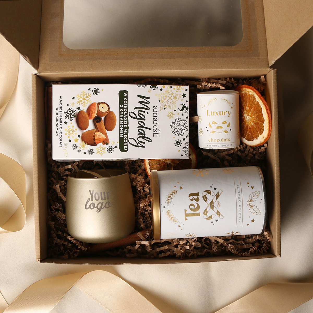 Das Set Sensitive beinhaltet: eine Windlicht Sensitive (mattgold) mit Soja-Teelicht und Veredelungsmöglichkeit, Amaresti Pralinen - Mandeln in Schokolade mit Zimt, Sencha-Grüntee mit Kirschen und Rosenblättern, verpackt in einer Röhre mit Wintermotiv, Luxury Chocolate - belgische Trinkschokolade in einer Röhre mit Wintermotiv. Das Ganze verpackt in einer stilvollen Öko-Kartonverpackung mit Fenster. Optionen für zusätzliche Veredelung: Druck auf der Windlicht, ein Anhänger mit Firmenlogo, ein Band oder eine stilvolle Hülle mit Wintermotiv, veredelt mit Goldakzenten.