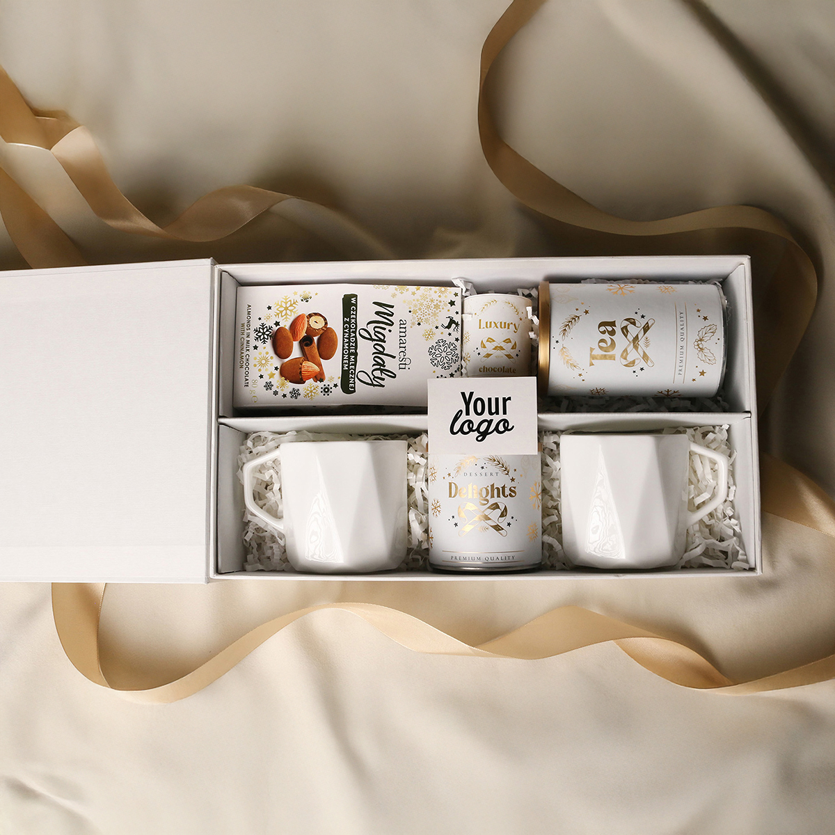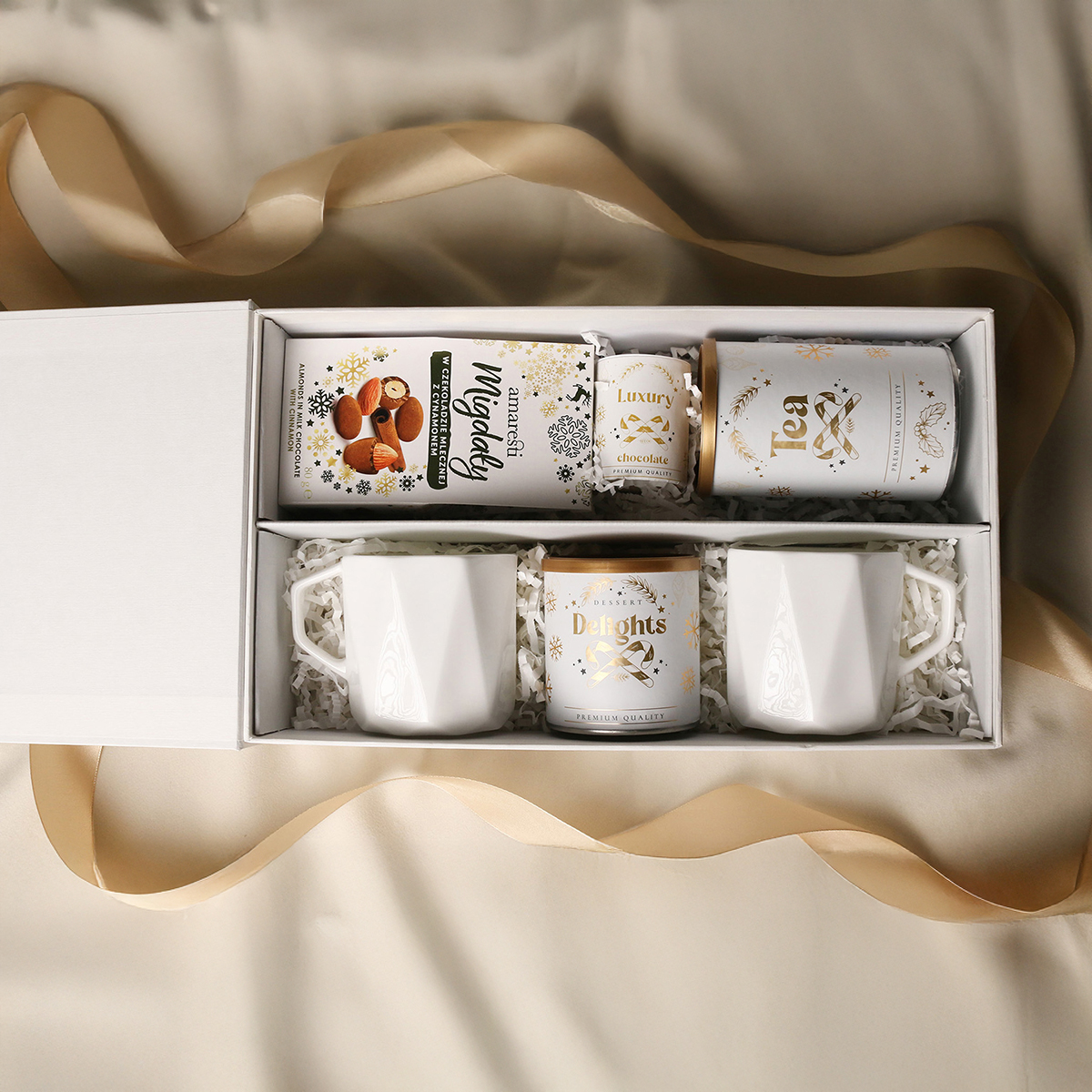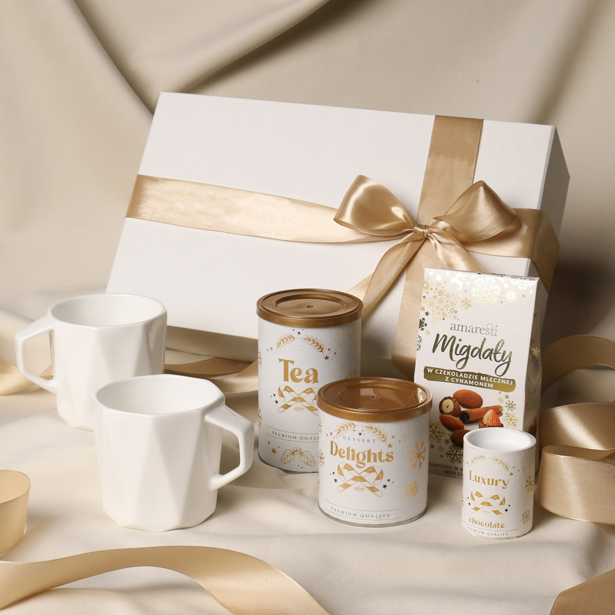 Exklusive Fine Bone China-Porzellanbecher – Crown – 2 Stk. Süße Mandeln in Milchschokolade mit Zimt Delicate Delights Pralinen – schwarze Johannisbeeren in weißer Schokolade mit Himbeerpulver 80g Aromatischer grüner Sencha-Tee mit Kirschen, Rosenblättern und Ginkgo-Biloba-Blättern 80g Exklusive Verpackung mit Magnetverschluss und Möglichkeit, passendes Band oder Banderole hinzuzufügen