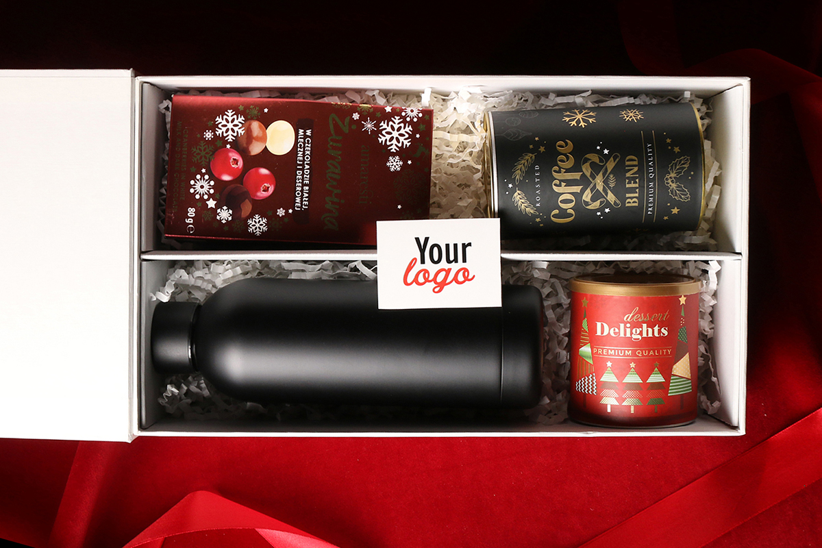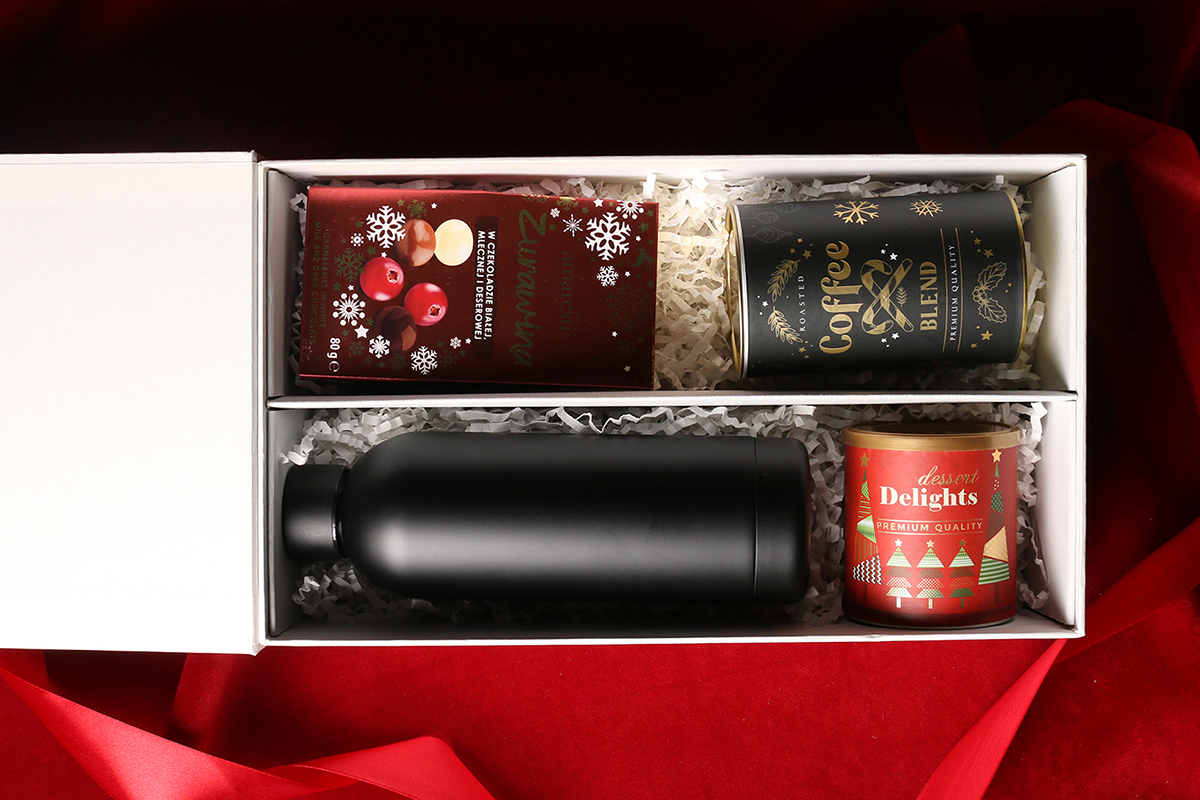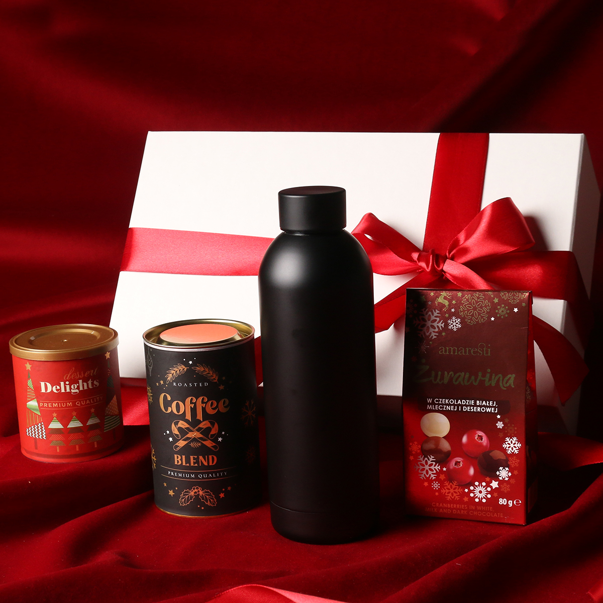 Praktische schwarze Apollo-Thermoflasche Cranberry-Pralinen in weißer, Milch- und Zartbitterschokolade Aromatische Arabica Brazil Cerrado Mineiro Kaffeebohnen in 150g Dose Delicate Delights Pralinen – schwarze Johannisbeeren in weißer Schokolade mit Himbeerpulver 80g Exklusive Verpackung mit Magnetverschluss und Möglichkeit, passendes Band oder Banderole hinzuzufügen
