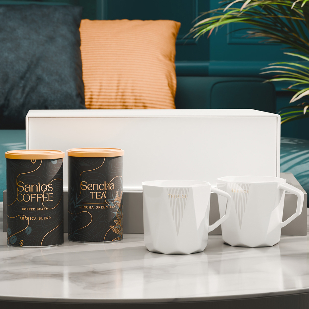 Ein luxuriöses Set auf Basis dünnwandiger Crown-Becher aus Fine Bone China ist ein Manifest des Prestiges. Im Inneren befinden sich außerdem ausgewählter „Santos Coffee“ und „Sencha Tea“ in eleganten Dosen. Das Ganze ist in einer exklusiven, schneeweißen Verpackung mit Magnetverschluss verpackt.